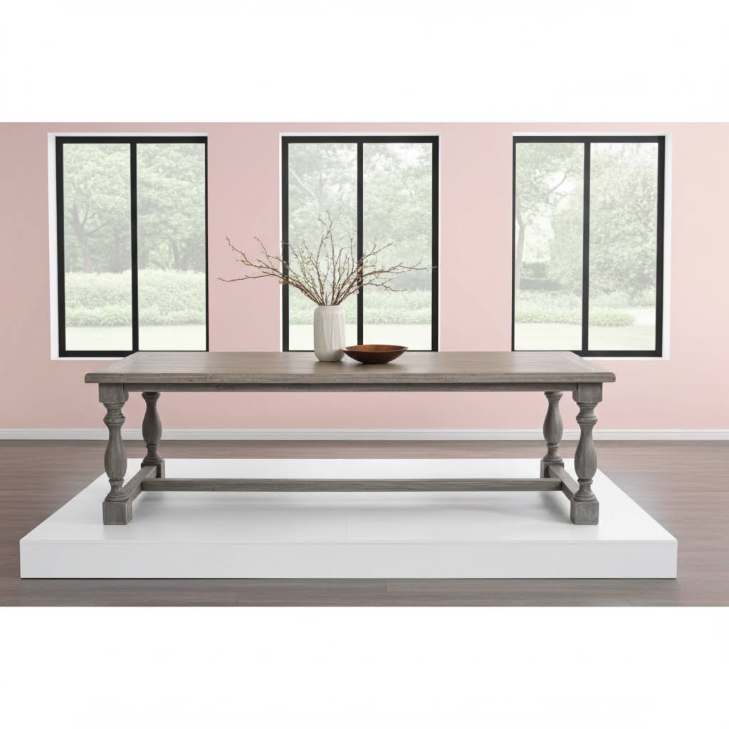 Der Esstisch CAMPA ist ein traumhaft schöner Blickfang für Ihr großes Esszimmer, Ihre Küche oder Ihre Gastronomie. Mit seinen markanten Säulen und der shabby-grauen Farbe verkörpert dieser Tisch authentischen Landhausstil mit Charakter.